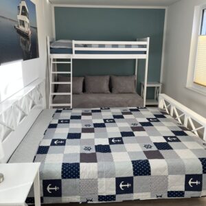 Schlafzimmer Stegseite mit Doppelbett und Etagenbett